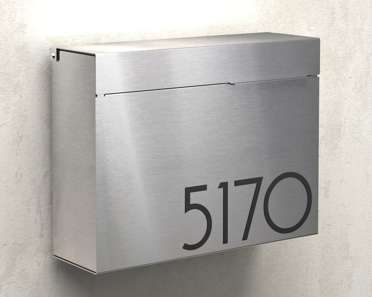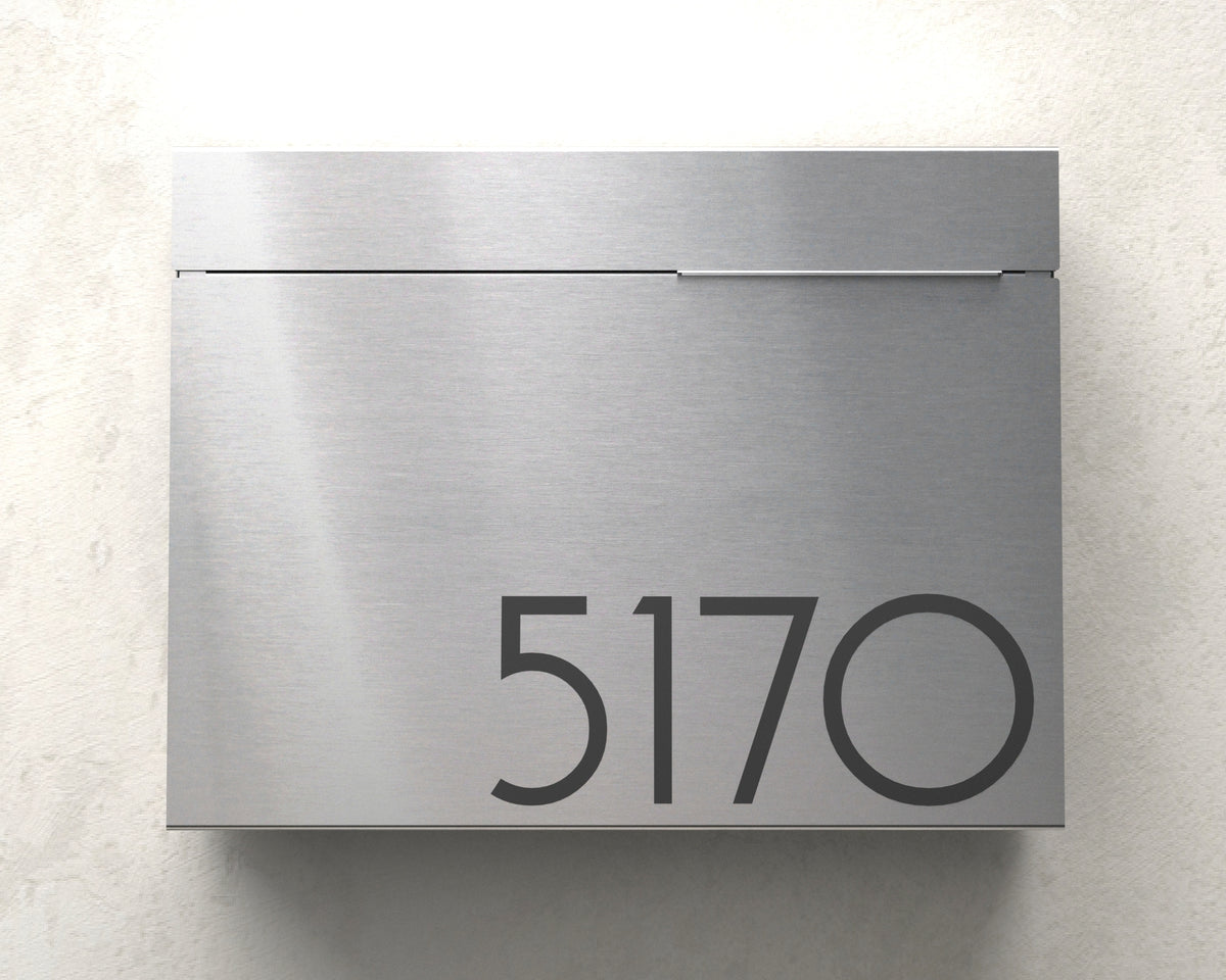 Our most popular large model, the Mitch wall-mounted mailbox, is exceptionally versatile and offers a unique look. Available in brushed stainless steel, marine-grade, and white-powder coated finishes, personalization is achieved through laser engraving. The Mitch can also be converted into a locking mailbox, with a mail slot measuring 12" x 3/4".